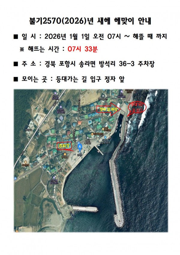 2026년 새해 해맞이 장소 안내 페이지 정보 작성자 보경사 작성일25-12-28 12:01 조회639회 댓글0건 본문 일출 07시 33분 입니다. 이전글 다음글 목록 댓글목록 등록된 댓글이 없습니다.
