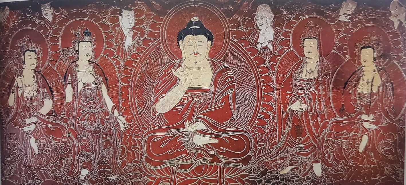 화면상단 본존의 광배주변에 가섭과 아난이, 양측에는 나한4위가 구름 사이사이로 상반신을 드러내고 있다. 본존과 보살상의 육신은 황색을 바르고, 나한상은 백색으로 발라 구분 짓고 있다.